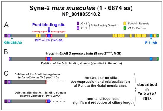 Syne-2/Nesprin-2 belongs to the nuclear envelope spectrin superfamily. It is a known mediator of nuclear migration and positioning during retinal development in flies, zebrafish, and mice [,], and it has been shown to be involved in ciliogenesis [,]. We have previously demonstrated a potential functional interaction between Syne-2/Nesprin-2 and Pcnt, a protein of the pericentriolar material and the basal body complex [,]. The subcellular localization of Syne-2/Nesprin-2 and Pcnt in the murine retina partially overlapped with the basal body complex of the connecting cilium, and the deletion of the Pcnt interacting domain from Syne-2/Nesprin-2 (Pcnt binding epitope of Syne-2: aa residues 1921–2066, Figure 2C) affected ciliogenesis and ciliary length control, and seems to play a role in centrosomal-mediated nuclear migration []. The aim of the present study was to further characterize the functional relevance of the Syne-2/Nesprin-2-Pcnt interaction for the structure and function of the retina, using a Syne-2/Nesprin-2 KO mouse model. As the published Syne-2 KO mouse with a deletion of the Syne-2 KASH domain and showing a retinal phenotype [] was no longer available (personal information Dr. Min Han, University of Colorado), we decided to employ the Syne-2/Nesprin-2 KO mouse model Nesprin-2△ABD (Syne-2tm1Ngl, MGI), which lacks the actin-binding domain (ABD) at the N-terminus of Syne-2. Expression analyses of the Nesprin-2△ABD mouse strain with the C-terminal antibody showed reduced expression of various smaller splice variants. The complete absence of protein variants with a molecular weight larger than 400 kDa (full-length protein 796 kDa) [] and thus the lack of the complete N-terminal protein made the mouse model very interesting for us. We assumed that this deletion will also affect the structure of the remaining protein and therefore the Pcnt/Syne-2 binding site near the N-terminus of Syne-2 (Figure 2).