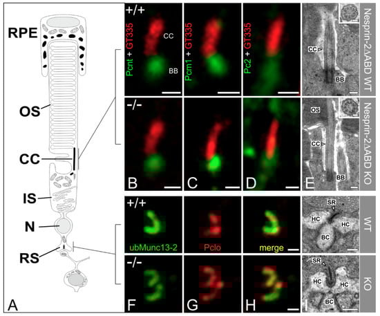 High-resolution microscopical analysis of the basal body complex and the ribbon synapse of Nesprin-2△ABD mouse strain (age 2–4 month). (A) Scheme of a vertebrate rod photoreceptor. (B–D) Photoreceptors connecting cilia (CC) of wild-type and knockout Nesprin-2∆ABD mouse retinae double-labeled with antibodies against Pcnt (B, MmPeriC1, green), Pcm1 (C, green), or Pc2 (D, green) as markers for the basal body complex (BBC) and polyglutamylated tubulin (GT335, red) as a marker for the ciliary apparatus. Pcnt and its interaction partners are localized at the BBC of the connecting cilium of the photoreceptor in wild-type and knockout Nesprin-2∆ABD retinae. (E) Representative electron micrographs of rod photoreceptor terminals, processed for best tissue preservation. (F–H) Presynaptic ribbon complex of wild-type and knockout Nesprin-2∆ABD mouse retinae labeled with antibodies against ubMunc13-2 and Piccolo. (I) Representative electron micrographs of rod photoreceptor terminals processed for best tissue preservation. The comparison of wild-type and knockout Nesprin-2∆ABD shows no ultrastructural alterations. Scale bars: 0.5 μm (B–D), 0.5 μm (H), 0.25µm (E,I), 0.1 μm higher magnification views (E).