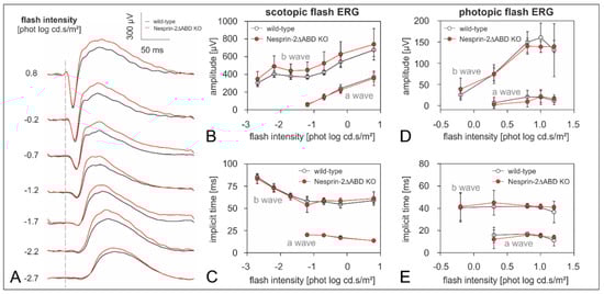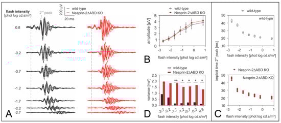 Full details of the general setup have been described elsewhere []. Briefly, animals (7 wild-type and 7 Nesprin-2∆ABD mice KO) were dark-adapted overnight for electroretinographic (ERG) measurements. All further handling was done under dim red light to maintain dark adaptation. Animals were anesthetized by an intramuscular injection of 50 mg/kg ketamine (Ketavet®, Pfizer Deutschland GmbH, Berlin Germany) and 10 mg/kg xylazine (Rompun® 2%, Bayer HealthCare AG, Leverkusen, Germany). A subcutaneous injection of saline (10 mg/kg 0.9%) kept them hydrated. Additional doses of anesthesia (max. 250 µg ketamine, 50 µg xylazine) were administered if necessary. The pupils were dilated with a drop of tropicamide (Mydriaticum Stulln® 5 mg/mL, Pharma Stulln GmbH, Stulln, Germany) and a drop of phenylephrine-hydrochloride (Neosynephrin POS® 5%, Ursapharm, Saarbrücken, Germany). The animal was then placed on a heated platform inside a Ganzfeld stimulator (Roland Consult Q450 SC, Brandenburg, Germany) to prevent hypothermia. Ground and reference needle electrodes were inserted subcutaneously at the tail base and on the forehead, respectively. Contact lens electrodes (Mayo Corporation, Aichi, Japan) filled with Corneregel® (Dr. Mann Pharma, Berlin, Germany) served as active electrodes. Afterward, the mice were allowed 10 min of dark adaptation. Initially, recordings (RetiPort system, Roland Consult, Brandenburg, Germany) to standard short flashes of varying strengths (white LED-flashes, −2.7, −2.2, −1.7, −1.2, −0.7, −0.2, and 0.8 phot log cd.s/m2 flash strength, 8–12 averages depending on flash intensity) to assay rod and combined rod-cone driven retinal function [] were done. The time between flashes of the same flash strength varied between 2 and 20 s and the time between two different flash strengths varied between 30 and 120 s to ensure dark adaptation. Subsequently, the animals were light-adapted to a 25 cd/m2 background for at least 5 min before photopic short-flash ERGs (white LED-flashes, −0.2, 0.3, 0.8, 1.0, and 1.2 phot log cd.s/m2 flash strength, 20 sweeps/average) and photopic flicker ERGs were recorded to examine cone driven retinal activity [] (8, 14, 26, and 30 Hz sine-wave modulation at 100% contrast and 60 cd/m2 mean luminance; 40 averages to one second episodes were obtained at each condition). After ERG recordings, the animals were transferred to a heating blanket where they were allowed to wake up.