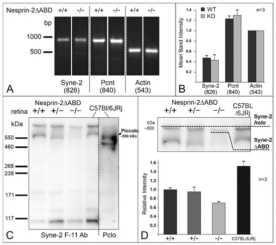 In an effort to achieve a better functional characterization of the Syne-2/Nesprin-2 interaction in the retina, we analyzed in the present study the only available Syne-2 KO mouse model Nesprin-2△ABD (Syne-2tm1Ngl, MGI). This mouse lacks the actin-binding domain (ABD) at the N-terminus of Syne-2 (exons 2-4). Previous characterization of the mouse model revealed reduced expression levels of smaller splice variants and the complete absence of variants with a molecular weight larger than 400 kDa (full-length protein 796 kDa) []. Based on these results, we assumed that the deletion would also affect the structure of the remaining protein and, therefore, the Pcnt/Syne-2 binding site at the N-terminus of the Syne-2/Nesprin-2 protein []. In the Syne-2/Nesprin-2 KO mouse retina, Syne-2 expression was attenuated in photoreceptors but Syne-2 protein localization was not altered. Furthermore, Pcnt localization and photoreceptor integrity in the retina of Syne-2/Nesprin-2 KO mice were comparable to wild-type (WT) controls and ERG recordings of Syne-2/Nesprin-2 KO retinae did not reveal an altered photoreceptor function. For the first time, detailed expression analyses finally showed an expression of a Syne-2/Nesprin-2 protein with a molecular weight of larger than 400 kDa in the Syne-2/Nesprin-2 KO mouse. These high molecular weight splice variants showed only a slight reduction of Syne-2/Nesprin-2 protein expression and still contained the Pcnt binding site.