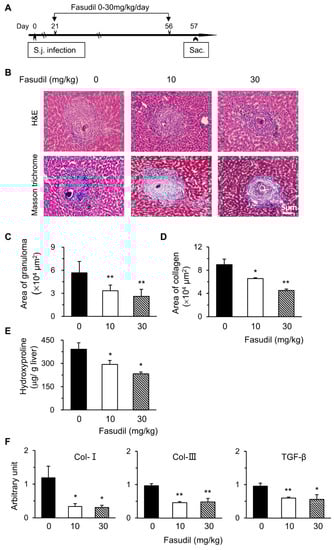 3.1. RhoA-ROCK Inhibitor Fasudil Suppresses Hepatic Granuloma Formation and Fibrosis in Mice Infected with S. japonicum