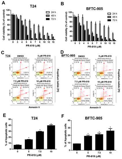 PR-619 induced cytotoxicity and apoptosis in human urothelial carcinoma cells in a dose-dependent and time-dependent manner. (A) T24 and (B) BFTC-905 cells were treated with various concentrations of PR-619 (3–15 μM) for 24 h, 48 h, and 72 h, respectively. Cell viability was assessed using the 3-(4,5-dimethylthiazol-2-yl)-2,5-diphenyltetrazolium bromide (MTT) assay. (C) T24 and (D) BFTC-905 cells were exposed to PR-619 (5, 7.5, and 10 μM) or DMSO for 24 h. Apoptotic cells were analyzed through FACS flow cytometry with propidium iodide and annexin V-FITC staining. (E,F) show the quantitative analyses of apoptosis presented as the means ± SD; * p < 0.05 compared with controls. All results shown are representative of at least three independent experiments.