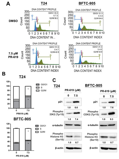 We examined the effect of PR-619 on the cell cycle progression of human UC cells. Flow cytometry analysis showed that PR-619-treated (7.5 μM) UC cells were blocked in the G0/G1 phase after 24 h (Figure 3A,B). UC cells treated by 7.5 uM PR-619 for 24 h decreased phospho-Histone H3 (Ser10); meanwhile, increased p21, a cyclin-dependent kinase (CDK) inhibitor, and phospho-CDK2 (Tyr15), a G0/G1 arrest marker, in both UC cells. All these results consistently indicated that PR-619 induced G0/G1 arrest in UC cells (Figure 3C).