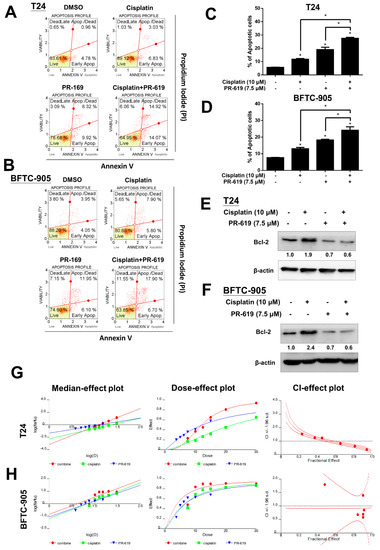We then examined the apoptotic effect of cisplatin (15 μM), PR-619 (7.5 μM), or in combination on T24 and BFTC-905 cells at 24 h. The data are presented in Figure 4. PR-619 in combination with cisplatin significantly potentiated apoptosis compared to that of cisplatin alone (Figure 4A–C). Western blotting showed that PR-619 in combination with cisplatin suppressed the cisplatin-induced overexpression of Bcl-2, an anti-apoptotic regulator. These data consistently indicated that PR-619 potentiated the apoptotic effect of cisplatin on UC cells. We also found that ABT-199, a Bcl-2 inhibitor, elucidated limited impact on the cytotoxicity of PR-619. This data indicated that suppression of Bcl-2 is essential for PR-619-induced cytotoxicity in UC cells (Figure S4). Additionally, T24 and BFTC-905 cells treated with PR-619 in combination with cisplatin at a 1:2 ratio for 24 h showed that PR-619 enhanced cisplatin-induced cytotoxicity (Figure 4G,H).