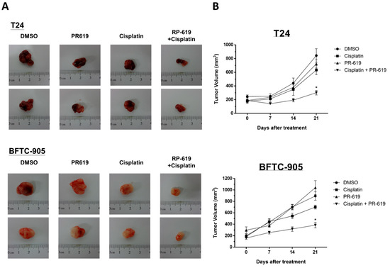 We evaluated the antitumor effects of treatment with cisplatin, PR-619, or combined treatment with cisplatin and PR-619 in vivo by using a xenograft mouse model. T24 and BFTC-905UC cells were mixed with Matrigel and injected subcutaneously into flanks of nude mice. As we described in the Methods section, mice were divided into four groups based on different treatment: DMSO (control, n = 5), cisplatin (n = 5), PR-619 (10 mg/kg/day, n = 5), or cisplatin combined with PR-619 (n = 5) for three weeks. Combined treatment with cisplatin and PR-619 showed the most significant antitumor effect on xenograft tumors of both T24 and BFTC-905 compared to single agent (cisplatin or PR-619) treatment (Figure 6A,B). In addition to drug combination treatment for improving the efficacy of chemotherapy, a novel agent for circumventing cisplatin resistance provided other solutions for this clinically unsolved issue. We further examined the antitumor effect of PR-619 on cisplatin-resistant UCs (T24/R) in vitro and in vivo. PR-619 induced cytotoxicity and apoptosis in a dose-dependent manner after 24 h treatment. The in vivo data exhibited using the xenograft mice model showed that PR-619 (10 mg/kg/day) inhibited tumor growth during a 28-day period of treatment (Figure S2).