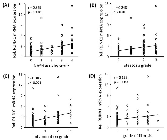 The transcription of RUNX1 gene is regulated by differential splicing and promoter utilization, which results in three major isoforms: RUNX1a, RUNX1b and RUNX1c [15]. In all the NAFLD samples analyzed in this study, we found RUNX1b as the predominant isoform (data not shown) and therefore, total RUNX1 expression levels correspond to RUNX1b. To analyze the relevance of RUNX1 mRNA expression with regard to disease progress in our patients, its correlation analysis was performed with the histopathological NASH activity score (NAS), the grade of steatosis, as well as inflammation, and the fibrosis score. RUNX1 mRNA expression demonstrated a significant positive correlation with NAS, steatosis and inflammation degree (Figure 1A–D). In addition to RUNX1, other validated DEGs (Table 1) showing significant correlations with histopathological disease progress are shown in Supplementary Figure S1A–D. RUNX1 target genes, CCL2 and PIK3CA significantly correlated to NAS, steatosis, inflammation grade and fibrosis score, NOS3 to NAS and inflammation grade and PRKCE to NAS and steatosis grade.