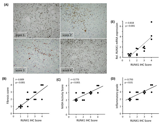 Immunohistochemical (IHC) analysis of RUNX1 expression in NASH patients. (A) RUNX1 immunostained images (20× objective) with an increasing number of brown nuclear immuno-positive cells (score 1–4). RUNX1 positivity was mostly observed in the non-parenchymal cells. Hematoxylin stained nuclei were distinguishable from RUNX1-positive brown nuclei. (B) Correlation between RUNX1 IHC and NASH activity score (n = 16), (C) RUNX1 IHC score and fibrosis grade (n = 16), and (D) RUNX1 IHC score and inflammatory grade (n = 16) in NASH patients. (E) Correlation between RUNX1 mRNA and its IHC score in liver tissues of patients (n = 16). The Pearson correlation (r) and statistical significance (p) were calculated.