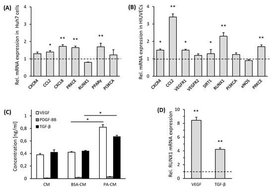 Moreover, HUVECs maintained for 24 h in culture medium (CM) from Huh7 cells treated with PA or BSA demonstrated a substantial upregulation of RUNX1 and its target gene CCL2, as well as the angiogenic gene expression of CXCR4, VCAM1, VEGFR1 and PRKCE after treatment with CM from PA-Huh7 cells (Figure 3B). To verify the impact of CM from PA-Huh7 cells on RUNX1 expression, HUVECs were solely incubated with 200 µM PA, showing a moderate increase of RUNX1 mRNA expression compared to the control cells, but considerably less than in PA-Huh7 CM treated HUVECs (Supplementary Figure S3B). However, only the PA treatment of HUVECs resulted in enhanced cell death and hence, this setup was not used in further assays (data not shown). Furthermore, we confirmed our results in mouse LSECs incubated with CM from primary mouse hepatocytes treated with PA for 24 h, showing a more than two-fold increase in the expression of RUNX1 mRNA compared to control cells (Supplementary Figure S3C).