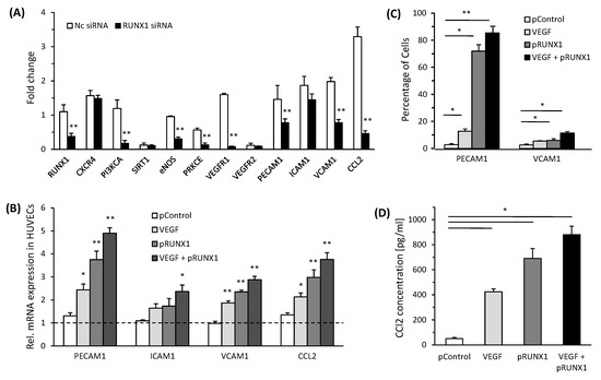RUNX1 alters expression of angiogenic and adhesion molecules in endothelial cells (A) HUVECs, treated with RUNX1 siRNA or NC siRNA and incubated with CM from PA-Huh7 cells, were analyzed for mRNA expression (fold change) of angiogenic, adhesion molecule and RUNX1 target genes (n = 3). (B) HUVECs transfected with RUNX1 expression plasmid (pRUNX1), control plasmid (pControl, i.e., empty vector) and/or incubated with VEGF (10 ng/mL) were analyzed for mRNA expression of adhesion molecule and chemotactic genes. HUVECs without any treatment were used as respective controls (Dotted line) (n = 3). 18S RNA expression was used for normalization. (C) Quantitative analysis of flow cytometry from (C) is shown (n = 3). (D) CCL2 levels (pg/mL) in culture media of HUVECs transfected with RUNX1 expression plasmid (pRUNX1), control plasmid (pControl, empty vector) and/or incubated with VEGF (10 ng/mL) (n = 4). Data represent mean ± SD. * p < 0.05 and ** p < 0.001.