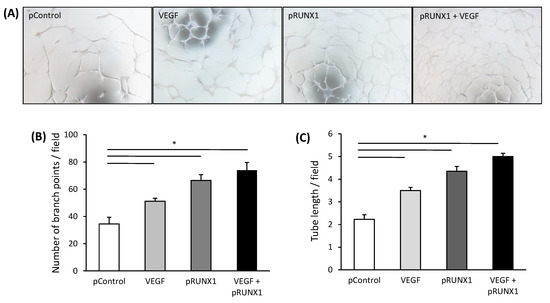 RUNX1 enhances the angiogenic activitiy of endothelial cells. (A) Representative tube formation images of HUVECs on matrigel (4× objective) transfected with RUNX1 expression plasmid (pRUNX1), control plasmid (pControl, empty vector) and/or incubated with VEGF (10 ng/mL). (B) Average number of branch points per field and (C) tube length per field formed by HUVECs on matrigel under conditions described in (A) (n = 3). Data represent mean ± SD. * p < 0.05.