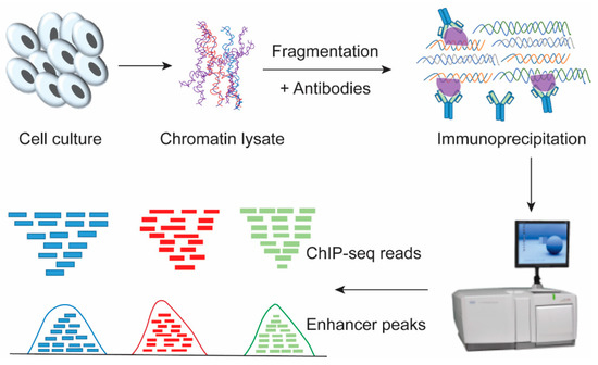 In recent years, the revolution in technology, especially high-throughput sequencing, has greatly increased our knowledge by identifying a large number of cis-regulatory elements, although many of them still need to be validated. Genome-wide evolution-based methods were used for finding enhancers that are highly conserved across species. Chromatin immunoprecipitation followed by massively parallel sequencing (ChIP-seq; Figure 2) is the most frequently used technology for identifying enhancer sequences across the genome, but it does not provide information on the regulatory roles or regulated target genes. The ChIP-seq method involves the cross-linking of cells by formaldehyde such that the physiological transcription factors-DNA interactions can be chemically fixed, and then, the chromatin is sheared into 300~1000 bp by sonication or enzyme, which enables specific recognition of antibodies with transcription factors-chromatin complexes [27,28,29,30]. The immunoprecipitated protein-DNA complexes were reversely crosslinked and the purified ChIP DNA was sequenced and analyzed. Another variant of ChIP-seq, called ChIP-exo, gives results at higher resolution and involves an additional step for exonuclease digestion, which cuts the DNA into fragments [31].