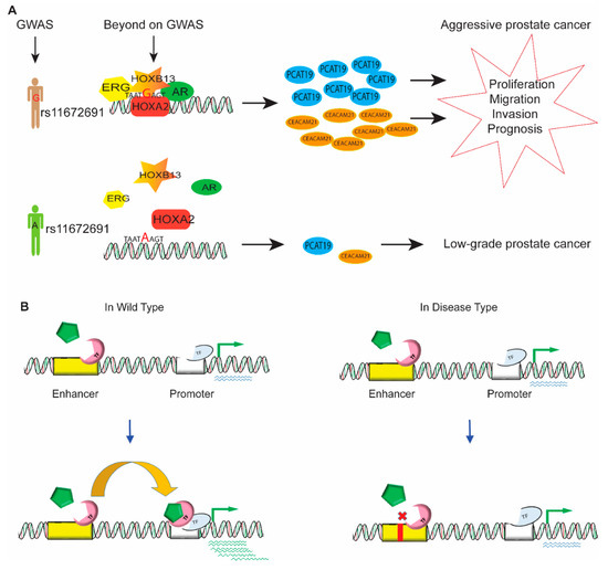 Successful completion of various human genome projects revealed that the human genome largely consists of noncoding DNA, which has no role in protein expression, but the preliminary result of the ENCODE project changed this presumption by defining the role of noncoding DNA in most (up to 80%) of the biochemical and regulatory activity of the genome. Genome-wide association studies and epigenomic profiling coupled with high-throughput sequencing have been used to identify a large number of genetic variations and chromosomal aberrations, which are risk factors for disease in the human genome, especially in cancer initiation and tumor progression [117]. However, it is still very difficult to determine the functional role of the genetic variations in noncoding DNA. These noncoding risk variants usually affect the cis-regulation of gene expression that results in the phenotypic variations in complex traits and cancer. For example, the risk SNP rs11672691, which is associated with aggressive prostate cancer, mediated the interaction of promoters and enhancers and regulated the expression of lncRNA PCAT19 [118,119]. Gao et al. revealed that the aggressive G allele of rs11672691 enhanced the binding of transcription factor HOXA2 and elevated the levels of the plausible candidate genes PCAT19 and CEACAM21, which are implicated in prostate cancer cell growth and progression (Figure 4A). A wide range of acting enhancers in the noncoding region of DNA participates in various regulatory activities of gene regulation and developmental processes. This part of the review discusses enhancer dysfunction due to genetic variations and chromosomal aberrations and addresses the ways these variations cause disease. Genetic variations and chromosomal aberrations affect the binding affinity of clusters of activators, mediators, and transcription factors, thereby dysregulating the expression of target genes and causing human disease (Figure 4B).