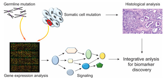 Integrated analysis of germline and somatic mutations. The mutation in germline and somatic cells can be tested by high-throughput sequencing techniques at the genetic or transcript level. Integrated analyses of disease-related gene expression or pathways combined with histological data might contribute to the identification of biomarkers for disease diagnoses and treatment.