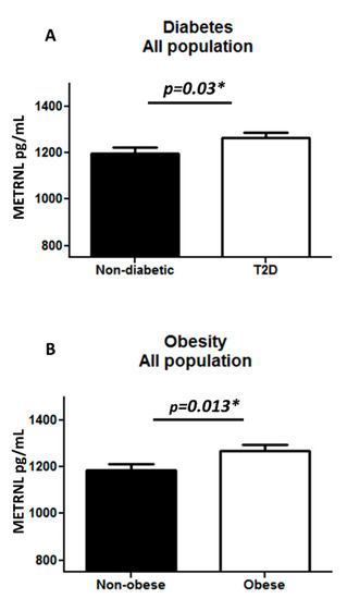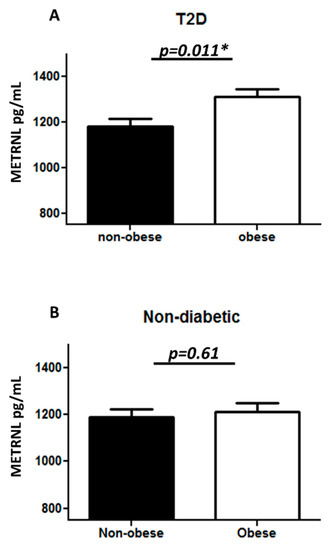 Meteorin-like hormone (METRNL) level in plasma in all populations (n = 228). (A) Comparing non-diabetic to T2D individuals; (B) comparing non-obese to obese individuals. The METRNL level in plasma was determined using enzyme linked immunosorbent assay (ELISA). The population was classified on the basis of their diabetic status (A). Diabetes was defined by fasting plasma glucose ≥ 126 mg/L (7 mmol/L). Furthermore, the population was classified on the basis of obesity (B). Obesity was defined based on BMI, where participants with BMI > 30 kg/m2 were considered obese and those with BMI between 20 and 30 kg/m2 were considered non-obese. Statistical assessment was 2-sided and considered statistically significant at * p < 0.05.