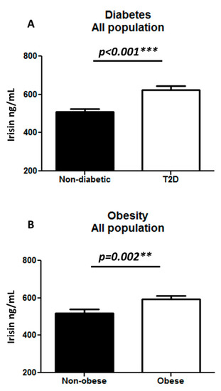 Irisin level in plasma in all populations (n = 228). (A) Comparing non-diabetic to T2D individuals; (B) comparing non-obese to obese individuals (n = 228). Irisin level in plasma was determined using enzyme linked immunosorbent assay. The population was classified on the basis of their diabetic status (A). Diabetes was defined by fasting plasma glucose ≥ 126 mg/L (7 mmol/L). Furthermore, the population was classified on the basis of obesity (B). Obesity was defined based on BMI, where participants with BMI > 30 kg/m2 were considered obese and those with BMI between 20 and 30 kg/m2 were considered non-obese. Statistical assessment was 2-sided and considered statistically significant at ** p < 0.01; *** p < 0.001.