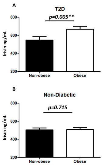 Irisin level in plasma following sub-classification into four groups: non-diabetic non-obese and obese (n = 124) and T2D non-obese and obese (n = 104). (A) Comparing the plasma level of irisin in non-diabetic non-obese and obese individuals; (B) comparing the plasma level of irisin in T2D non-obese and obese individuals. Irisin level in plasma was determined using enzyme linked immunosorbent assay. The population was classified on the basis of their diabetic status and further sub-classified on the basis of obesity. Diabetes was defined by fasting plasma glucose ≥ 126 mg/L (7 mmol/L). Obesity was defined based on BMI, where participants with BMI > 30 kg/m2 were considered obese and those with BMI between 20 and 30 kg/m2 were considered non-obese. Statistical assessment was 2-sided and considered statistically significant at ** p < 0.01.