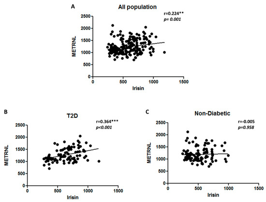 Correlation analysis between METRNL and irisin levels in plasma. (A) All populations. (B) Individuals with T2D. (C) Non-diabetic individuals. METRNL and irisin levels in plasma were determined using enzyme linked immunosorbent assay. Diabetes was defined by fasting plasma glucose ≥ 126 mg/L (7 mmol/L). Spearman correlation coefficient was used to determine the association of METRNL with irisin. Statistical assessment was 2-sided and considered statistically significant at ** p < 0.01; *** p < 0.001.