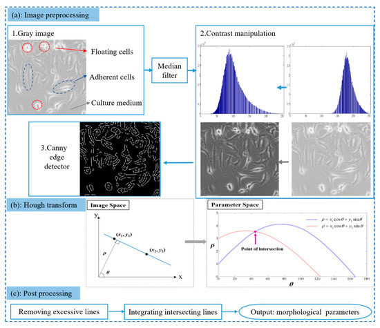 The images of the cells recorded by a digital camera are fairly complicated due to the different cell growth stages, cell numbers, and the mixtures of various substance (adherent cells and floating cells) (Figure 1). All of that added the difficulty of image processing. To ensure the robustness of our method in complex situations, we designed the following three processes: (a) image preprocessing, (b) HT, and (c) post-processing (Figure 1). These processes emphasize the important information in the image and ignore the other noise. Our framework was realized by programming based on MATLAB R2014a.