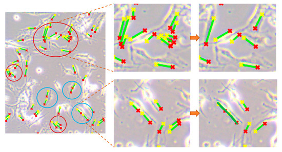 After all the straight lines in the images are marked, some unreasonable results remain when quantifying the morphological characteristics of the cells. Hence, we divided the unreasonable detections into two categories: (1) one cell might be marked by approximate parallel lines more than once, as shown in Figure 2 (red circles); (2) a slender cell might be described by several discrete lines (blue circles), where the lines should be joined into a longer line to represent the real attributes of the cell. Since these issues can impact the accuracy of the results, we had to correct the detections after Hough transformation. First, if the minimal distance between two lines was fewer than 15 pixels and with an included angle less than 20°, the shorter line would be removed, while retaining the longer one to mark the cell. Secondly, lines with intersection points or very close were integrated as a longer piecewise line to represent a cell. Correcting the above unreasonable detections can guarantee the accuracy of cell quantification. Finally, the line lengths of cells and the number of lines were output as morphological parameters to indicate the cells’ dynamic changes under different treatments. We selected several typical images to validate the results from the algorithm and manual detections (Figures S1 and S2), provided the scatter plots of real length and detected length (Figure S3) and compared the error of detected length among different groups (Figure S4).