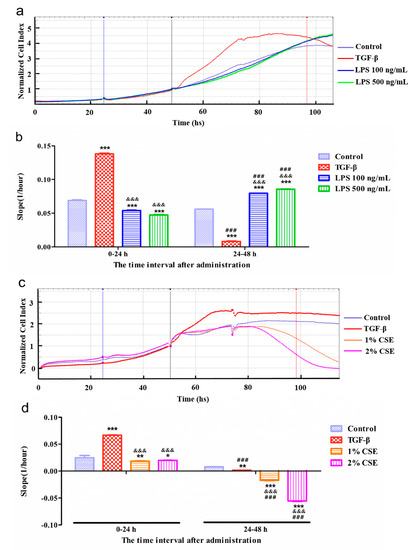To investigate the changes in the cell index, we stimulated A549 cells with TGF-β (10 ng/mL), LPS (100 and 500 ng/mL), and CSE (1% and 2%), in the xCELLigence RTCA SP system. As shown in Figure 4a,c, the normalized cell index curve of the TGF-β group showed an arch structure and stayed at the peak position at 24–48 h, whereas the LPS groups had a curve similar to the control group. After administration 24 h, the slope of the TGF-β group significantly increased, whereas those of the LPS groups decreased compared with the control group (Figure 4b). However, in the next 24 h, the tendency of the curves changed when compared to the control group. The TGF-β group was significantly decreased, whereas the LPS groups were still increasing. Additionally, we found that the cell index in the CSE groups decreased in a dose-dependent manner (Figure 4c,d). For we observed the shape was the arch structure in TGF-β group, we further confirmed the shape by statistical analysis as showed in Figures S5–S7. The variations in the curve were significantly different in Figure S7.