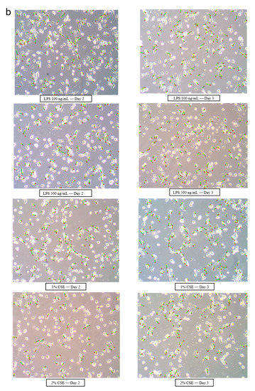 Morphological analysis of A549 cells using image processing techniques. The original pictures were obtained by optical microscope (200× magnification). (a) Representative images of A549 cells in the control and TGF-β groups from days 0 to 3. (b) Representative images of A549 cells in LPS (100 and 500 ng/mL) and CSE (1% and 2%) groups on days 2 and 3 (green: cell length; red: start point; yellow: end point).