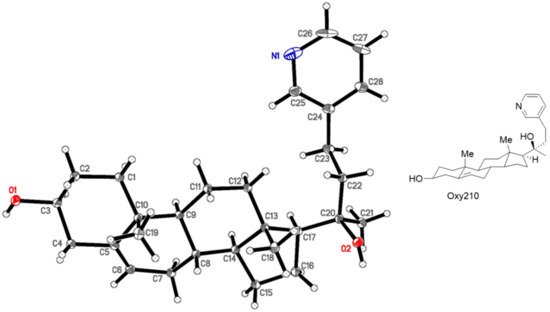 (3S,8S,9S,10R,13S,14S,17S)-17-((R)-2-hydroxy-4-(pyridin-3-yl)butan-2-yl)-10,13-dimethyl-2,3,4,7,8,9,10,11,12,13,14,15,16,17-tetradecahydro-1H-cyclopenta[a]phenanthren-3-ol (Oxy210): Oxy210 was prepared in three synthetic steps depicted in Scheme 1. Briefly, pregnenolone was condensed with nicotinaldehyde to the enone which was reduced to a ketone via hydrogenation using Lindlar’s catalyst. The ketone was reacted with methyl lithium to afford the 20(R)-tertiary alcohol, Oxy210. The crude product was purified by chromatography on silica. 1H NMR (400 MHz, CDCl3) δ 8.45 (1H, d, J = 1Hz), 8.42 (1H, dd, J = 5, 2 Hz), 7.53–7.48 (1H, m), 7.23–7.18 (1H, m), 5.35–5.31 (1H, m), 3.56–3.45 (1H, m), 2.79–2.63 (2H, m), 2.33–2.17 (2H, m), 2.05 (1H, m), 2.01–1.26 (16 H, m), 1.23 (3H, s), 1.18–0.89 (3H, m), 0.98 (3H, s), 0.87 (3H, s); 13C NMR (100 MHz, CDCl3) δ 149.7, 147.1, 140.8, 138.1, 135.8, 128.6, 123.4, 121.4, 75.5, 71.6, 58.7, 56.9, 50.0, 44.1, 42.9, 42.3, 40.3, 37.2, 36.5, 31.7, 31.6, 31.3, 27.5, 26.7, 23.7, 23.2, 20.9, 19.3, 13.7. MS (ESI + ve): [M + H] = 424.31 conforms to structural formula C28H41NO2, MW = 423.31. A 5 mg portion of Oxy210 was dissolved in MeOH (0.5 mL) and crystallization was induced by slow evaporation of the solvent. Single crystal X-ray diffraction data were collected at 100K on a diffractometer with Bruker Apex-II CCD detector and a Cu-micro focus source. Crystal data: Orthorhombic, a = 7.2736(2) Å, b = 13.3504(4) Å, c = 26.2632(8) Å, α = 90° β = 90°, γ = 90°, Vol. = 2550.30(13) Å3, Space group = P212121. The final anisotropic full matrix least-squares refinement on F2 converged at R1 = 0.0319, wR2 = 0.088, GOF = 1.01. Analysis of the structure indicates that observed conformational details are intra-molecularly controlled and that the influence of crystal packing forces on the sterol conformation is negligible. Figure 2: Ortep representation of Oxy210 in the solid state.