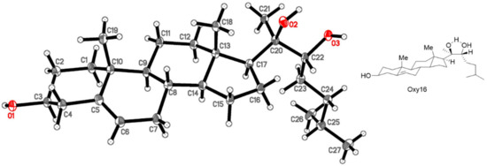 (2R,3R)-2-((3S,8S,9S,10R,13S,14S,17S)-3-hydroxy-10,13-dimethyl-2,3,4,7,8,9,10,11,12,13,14,15,16,17-tetradecahydro-1H-cyclopenta[a]phenanthren-17-yl)-6-methylheptane-2,3-diol (Oxy16): Oxy16 (20α,22(R)-dihydroxycholesterol) was prepared in four steps as previously described by Watanabe et al. [24] 1H NMR (CDCl3, 300 MHZ) δ: 5.36 (1H, m), 3.51 (1H, m), 3,41 (1H, m), 2.41 − 1.5 (15H, m), 1.22–0.95 (5H, m), 1.21 (3H, s), 1.01 (3H, s), 0.91 (3H, d, J = 6 Hz), 0.90 (3H, d, J = 6 Hz), 0.89 (3H, s). 13C NMR (CDCl3, 75 MHZ) δ: 140.69, 121.44, 76.30, 71.63, 56.6, 54.65, 49.96, 43.10, 42.16, 40.10, 37.15, 36.40, 36.24, 31.66, 31.52, 31.19, 29.07, 27.98, 23.84, 22.84, 22.26, 21.84, 20.85, 20.29, 19.29, 13.47. MS (ESI): mass calcd. for C27H42O, 383.3314; m/z found, 383.3326 [M − 2 H2O]+. A 5 mg portion of Oxy16 was dissolved in EtOAc (0.5 mL) and crystallization was induced by slow evaporation of the solvent. X-ray diffraction data were collected at 100K on a diffractometer with Bruker Apex-II CCD detector and a Cu-micro focus source. Crystal data: Monoclinic, a = 6.2273(2) Å, b = 27.949(1) Å, c = 17.2896(6) Å, β = 91.788(2), Vol. = 3007.7(2) Å3, Space group = P21. The structure was refined as a two-component twin and the final anisotropic full matrix least-squares refinement on F2 converged at R1 = 0.054, wR2 = 0.153, GOF = 1.08. Analysis of the structure indicates that observed conformational details are intra-molecularly controlled and that the influence of crystal packing forces on the sterol conformation is negligible. Figure 3: Ortep representation of Oxy16 in the solid state.