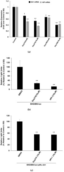 Oxy210 acts downstream of Smo. (a) Sufu-/- MEF cells were treated with DMEM containing 5% FBS in the presence or absence of Oxy210. After 72 h, RNA was extracted and analyzed by Q-RT-PCR for the expression of Hh target genes Gli1 and Hip, normalized to Oaz1 expression. (b) Sufu-/- cells cultured in 24 well-plate were transfected with a Gli response-element reporter (pGL3b-8xGliBS-Luciferase) plasmid and a pSV40-Renilla-Luciferase plasmid. 6 hrs after transfection, cells were treated with the compounds as indicated for 72 hrs. Luciferase activity was measured and normalized to the Renilla luciferase activity. (c) NIH3T3 cells cultured in 24 well-plate were transfected with a Gli response-element reporter (pGL3b-8xGliBS-Luciferase) plasmid, a pSV40-Renilla-Luciferase plasmid and a vector expressing Gli1, pSRa-Gli1. 6 h after transfection, cells were treated with the test agents as indicated for 72 hrs. Data from a representative experiment are reported as the mean of triplicate determinations ± SD (* p < 0.05 vs. DMSO or control; ** p < 0.01 vs. DMSO or control).