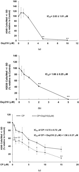 Inhibition of NSCLC cell proliferation by Oxy210. A549 (a), (c) and H2030 (b) cells were treated with the test agents as indicated in RPMI 1640 containing 5% FBS for 5 days and then were trypsinized and counted as described in Methods and Materials section. Data from a representative experiment are reported as the mean of triplicate determinations ± SD (* p < 0.05 vs. control; ** p < 0.01 vs. control).
