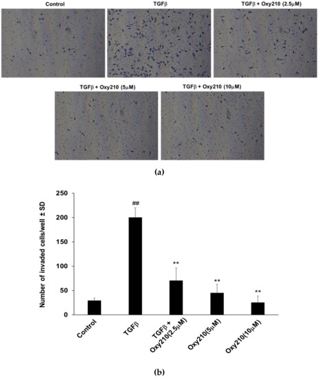 Inhibition of TGFβ-induced invasive activity of A549 cells. In vitro invasion assays were performed using chambers with matrigel-coated membrane as described in the Materials and Methods section. (a) Images of invaded cells on the membranes. (b) Quantitative analysis of invasion of A549 cells induced by TGFβ in the absence or presence of Oxy210. Data from a representative experiment are reported as the mean of triplicate determinations ± SD (** p < 0.01 vs. TGFβ treated cells; ## p < 0.01 vs. control).