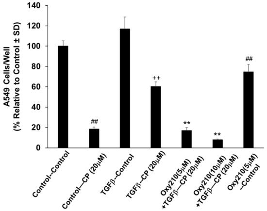 Effect of Oxy210 on TGFβ-induced resistance to carboplatin. A549 cells were treated with the agents as indicated (in front of --) in RPMI 1640 containing 2% FBS for 3 days, and then treated with the agents as indicated (after --) for 4 days. The cells were then trypsinized and counted. Data from a representative experiment are reported as the mean of triplicate determinations ± SD (## p < 0.01 vs. Control--Control; ++ p < 0.01 vs. Control--CP; ** p < 0.01 vs. TGFβ--CP).