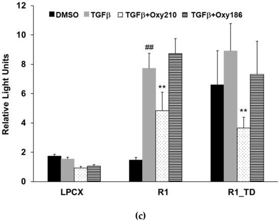 A549 cells were pretreated with DMSO, Oxy186 (10 μM) or Oxy210 (10 μM) for 3 h, then treated with TGFβ (4 ng/mL) for the indicated times. After treatment, the cells were harvested in Triton lysis buffer (1% Triton X-100, 25 mM Tris-HCl, pH 7.4, 300 mM NaCl with protease and phosphatase inhibitors), and the supernatant was collected as cell lysates after centrifugation (15,000× g, 25 min at 4 °C). A Bradford assay was used to measure the protein concentration. 10 ng proteins of each sample were loaded into the wells of an 8% SDS-PAGE gel, and the proteins were transferred to a PVDF membrane after SDS-PAGE gel separation. The membrane was blocked with 5% milk for 1 h at room temperature and then incubated at 4 °C with appropriate dilutions of primary antibody (pSMAD2: 1:1,000, Cell Signaling Technology, Danvers, MA, USA #3108; pSMAD3, 1:5,000, Rockland Immunochemicals Inc., Pottstown, PA, USA #600-401-919; SMAD2, 1:1,000, Abcam, Cambridge, UK #ab63576; SMAD3, 1:1,000, Abcam #ab40854; HSC70, 1:10,000, Santa Cruz Biotechnology, Dallas, TX, USA #sc-7298. After washing steps, the membrane was incubated with horseradish peroxidase conjugated secondary antibody with 1:5,000 dilution (Cell Signaling Technology #7074 or #7076) at room temperature for 1 h. West Pico PLUS Chemiluminescent Substrate #34578 (Thermo Fisher Scientific, Waltham, MA, USA) was used to develop the signal, and the images were acquired using HyBlot films #E3018 (Denville Scientific Inc., Metuchen, NJ, USA) and a darkroom developer. Densitometry readings were performed with ImageJ software (Version 1.52a, NIH, Bethesda, MD, USA, see Supplementary Materials).