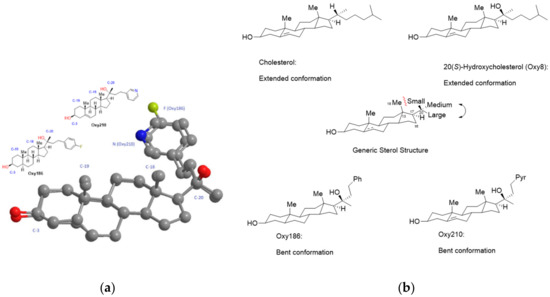 Conformational properties of Oxy186 and Oxy210 (a) The molecular structures of Oxy186 and Oxy210 and an overlay of their crystal structures. A structure alignment algorithm (Mercury, The Cambridge Crystallographic Data Centre) determined the minimal root mean square deviation (RMSD) of atomic positions in the overlay to equal 0.221 Å. (b) Varying the substitution pattern and stereochemical configuration of the C17–C20 bond, can result in a preference for either an extended or bent conformation of the ‘Large’ substituent, usually the sterol side, with respect to the tetracyclic sterol core.