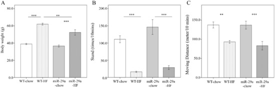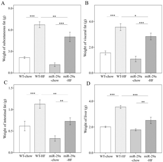 3.1. Overexpression of miR-29a Significantly Reduces Weight Gain, Fat Accumulation in Adipose Tissue, and Liver Weight in the Context of Chronic HFD