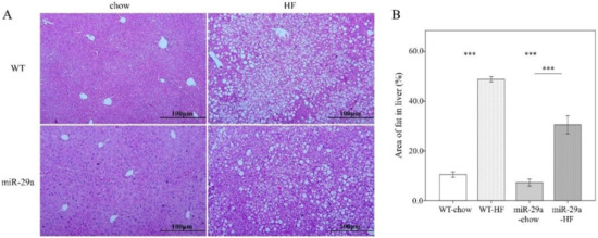 3.2. Overexpression of miR-29a Reduces Hepatocellular Steatosis and Fibrosis in the Context of Chronic HFD