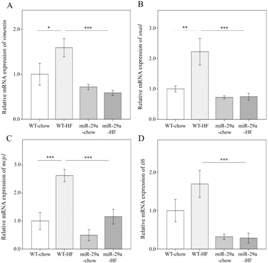 3.3. Overexpression of miR-29a Represses Hepatic Epithelial-to-Mesenchymal Transition (EMT) and Inflammation in the Context of Chronic HFD