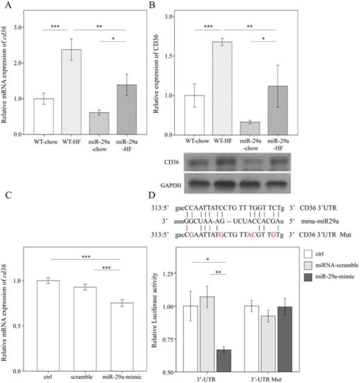 3.5. miR-29a Inhibits the Expression of Fatty Acid Translocase CD36 by Targeting 3’ UTR