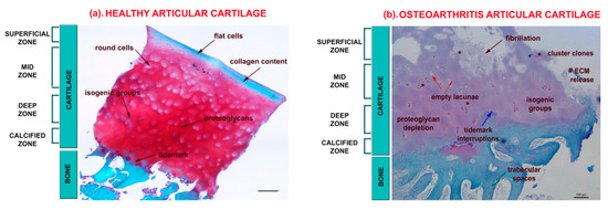 Representative micrographs of articular cartilage tissues representing healthy (a) and OA (b) stained with Safranin-O/Fast Green staining taken from the laboratory archive. Representation of typical healthy and OA features in the superficial, mid, deep, and calcified zones of articular cartilage. Scale bar: 100 µm; red staining: proteoglycan content; pinkish staining: depletion of proteoglycan content; green staining: collagen content. (a) Healthy articular cartilage, black arrows report: (i) the presence of flat cells in the ECM rich of collagen fibres in the superficial zone; (ii) the presence of round cells in the ECM rich of proteoglycans in the mid-zone; (iii) the presence of isogenic groups in the ECM rich of proteoglycans in the deep zone; and (iv) the presence of tidemark in the calcified zone. (b) OA articular cartilage, black arrow reports the presence of fibrillation in the superficial zone; red arrows report the presence of empty lacunae; blue arrow: tidemark interruptions; green arrow: trabecular spaces; # reports ECM release; * cluster clones.