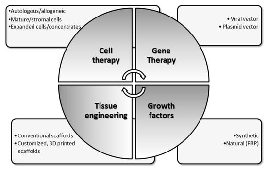 Most recently developed regeneration strategies use a combination of several technologies that led to the development of different therapeutic solutions and methodologies: cell therapy; tissue engineering; gene therapy [26] (Figure 2).