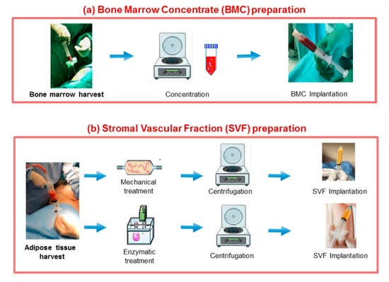 Schematic representation of the procedures needed to obtain (a) bone marrow aspirate (BMC) through a cell concentration step, from bone marrow; (b) stromal vascular fraction (SVF) from adipose tissue (enzymatic and mechanical procedures, followed by centrifugation).