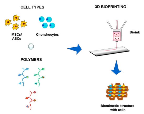 Additive manufacturing, also known as 3D printing or rapid prototyping, allows the fabrication of 3D scaffolds (computer-aided manufacturing, CAD), starting from computer-aided design (CAD) models obtained, for example, from MRI scans of patient lesions. It is usually realized in a layer-by-layer approach, as opposed to traditional subtractive methods where the material is removed from a starting piece to obtain the final product [98]. Additive manufacturing ensures more precision in object processing, allowing a better ability to mimic the structural, functional, and mechanical characteristics of native cartilage tissue (Figure 2). The possibility of creatinf scaffolds starting from the patient’s medical images, so as to match the size and shape of cartilage lesions, i.e., to tailor therapy, is promising for better addressing cartilage lesion repair [99]. Recently, the development of bioprinting technology allowed the deposit of layers composed of cells and polymeric materials (the combination often referred to as bioink), in order to form living tissues to be implanted with better possibility for successful treatment [100] (Figure 4). We believe that the bioprinting approach will allow a better mimic of hyaline cartilage architecture, facilitating advances in our endeavour to achieve optimal regeneration.