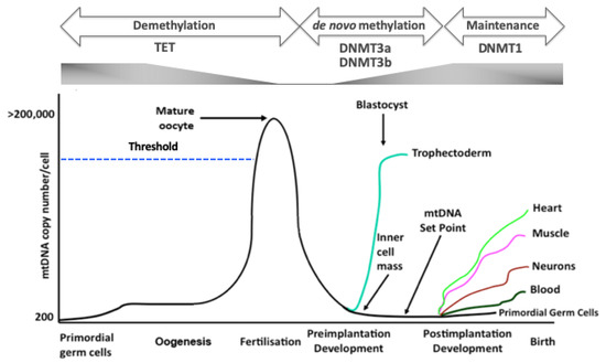 DNA methylation and mtDNA replication. Primordial germ cells, the very first germ cells laid down, possess very few copies of mtDNA. During oogenesis, mtDNA copy number increases exponentially to cross the threshold (broken blue line) that is required for the mature, metaphase II oocyte to complete fertilisation and preimplantation development. Throughout preimplantation development, mtDNA copy number decreases and mtDNA replication is then initiated at the blastocyst stage, but this is restricted to the trophectodermal cells. On the other hand, the cells of the inner cell mass continue to reduce mtDNA copy number. As a result, the developing embryo establishes the mtDNA set point, the founder molecules of mtDNA that contribute to the cells, tissues and organs of the foetus and offspring, which takes place before differentiation. Once naïve cells commit to a specific lineage, mtDNA replication takes place in a cell-specific manner, which allows cells to perform their specialized functions by allowing them to utilise oxidative phosphorylation (OXPHOS), if required. To this extent, cells (heart, muscle, neurons) that primarily have a high requirement for ATP through OXPHOS will have high mtDNA copy number and those with a low requirement for OXPHOS (blood) will tend to have lower mtDNA copy number and predominantly utilise glycolysis. Throughout development, there are synchronous changes to DNA methylation and gene expression. Translocation methylcytosine dioxygenases (TET) enzymes are responsible for erasing parental DNA methylation patterns through to the blastocyst stage. However, the de novo methyltransferases, for example DNMT3a and DNMT3b mediate de novo DNA methylation through preimplantation development and onwards. DNMT1 is then employed to maintain cell-specific DNA methylation profiles.