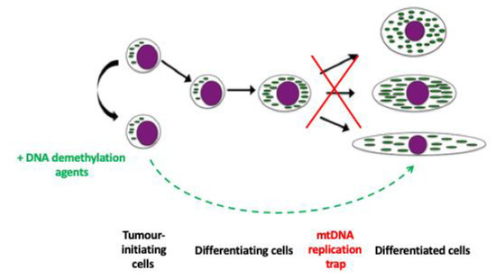 Tumour cells that exhibit a stem cell-like nature, such as Glioblastoma multiforme (GBM) cells [46,47], can give rise to severe forms of cancer with a low rate of survival [48]. Unlike stem cells, they are unable to complete the process of differentiation and replicate their mtDNA in an asynchronous manner [47] and, consequently, they are trapped at an early stage of differentiation [49] (Figure 2). However, when GBM cells are treated with 5-Azacytidine or another DNA demethylation agent, vitamin C, they initiate and progress differentiation [47] (Figure 2). Indeed, they revert from a hypermethylated to a more hypomethylated state, as demonstrated by global DNA methylation analysis [50]. In line with this outcome, a number of the mtDNA replication factors also undergo DNA demethylation with the most striking effects for POLG and TOP1MT [50] and, consequently, they replicate mtDNA [47,50]. Interestingly, global DNA demethylation also mediates DNA demethylation of the mitochondrial genome [50].