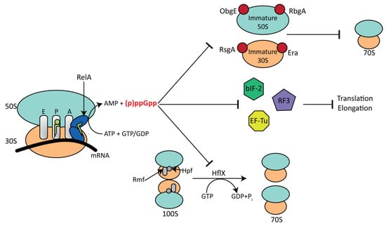 - Corrigan, R.M.; Bellows, L.E.; Wood, A.; Gründling, A. ppGpp negatively impacts ribosome assembly affecting growth and antimicrobial tolerance in Gram-positive bacteria. Proc. Natl. Acad. Sci. USA 2016, 113, E1710–E1719. [Google Scholar] [CrossRef]