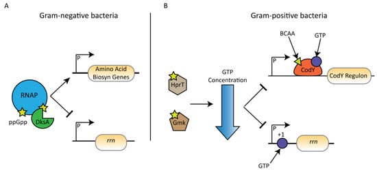 - Barker, M.M.; Gaal, T.; Josaitis, C.A.; Gourse, R.L. Mechanism of regulation of transcription initiation by ppGpp. I. Effects of ppGpp on transcription initiation in vivo and in vitro. J. Mol. Biol. 2001, 305, 673–688. [Google Scholar] [CrossRef] [PubMed]