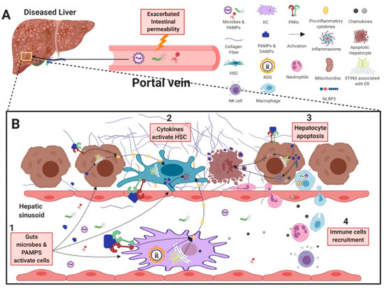 Gastrointestinal microbes and their contribution to liver inflammation and fibrosis. (A) In chronic liver disease, gut microbes and PAMPs can cross the intestinal barrier due to an increase in intestinal permeability, resulting in their transport into the liver through the hepatic portal vein. (B1) Gut-derived antigens are recognized by, and activate HSCs, KCs, and hepatocytes, resulting in the secretion of pro-inflammatory cytokines and chemokines. (B2) Pro-inflammatory cytokines produced from KCs and hepatocytes further activate HSCs to further exacerbate fibrogenesis. (B3) In addition, activation of STING– and NLRP3–inflammasome pathways in hepatocytes can trigger apoptosis and release of DAMPs to further activate HSCs. (B4) Chemokines produced by activated KCs, HSCs, and hepatocytes recruit immune cells such as neutrophils, NK cells, and monocytes to further exacerbate liver inflammation and injury. PAMP: pathogen associated molecular pattern; KC: Kupffer cell; HSC: hepatic stellate cell; NK cell: natural killer cell; PRR: pattern recognition receptor; TLR: Toll-like receptor; NOD: nucleotide-binding oligomerization domain-containing protein 1; NLRP3: nucleotide-binding oligomerization domain, leucine-rich repeat- and pyrin-domain-containing 3; STING: stimulator of interferon genes; DAMP: damage associate molecular pattern.