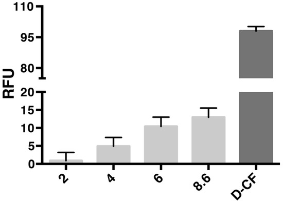 Screening of liposome concentration for CF expression of AqpZ-sGFP. The final concentrations of lipids were indicated with numbers below the bar chart. The reaction mixture with 8.6 mg/mL final lipid concentration without the AqpZ-sGFP plasmid template was used as the negative control. D-CF sample was used as positive control. RFU, relative fluorescent unit.