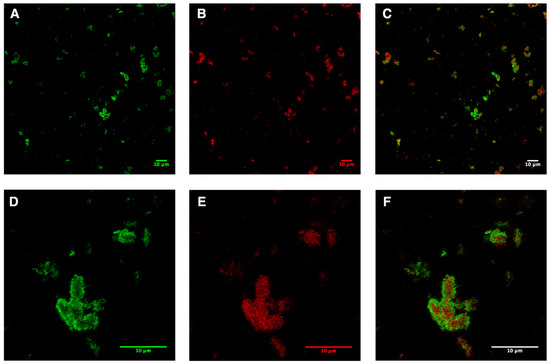 Confocal microscopy analysis of AqpZ-sGFP pellet fractions produced from l-CFPS directly after expression. (A,D), signals of sGFP in the pellet fractions shown in green; (B,E), signals of lipids in the pellet fractions in red (stained via Nile red); (C,F), merged images of the green and red channels. Scale bar indicates 10 μm.