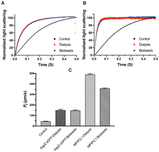 Quite a number of detergents like Triton™X-100, DDM, DM, and β-OG, among others, were used for membrane protein reconstitution [28]. Previous reports showed that Triton™X-100 had better performance in membrane reconstitution via bio-beads, while DDM tend to disrupt the structure of the liposome at high concentrations [28,34,35]. In addition, based on previous reports on the in vitro reconstitution of aquaporins using Triton™X-100 [9], Triton™X-100 was selected instead of DDM in this study. β-OG was selected as the second detergent because it is often used as the detergent for in vitro reconstitution, followed by dialysis as the detergent removal method [36]. From the representative fluorescent image of AqpZ-sGFP in Figure 4, both methods for detergent removal were successful in reforming homogenous proteo-liposomes. Stepwise dialysis to remove β-OG showed a slightly higher water permeability, similar to that with bio-beads. Similar findings (that stepwise dialysis could yield high integration) were also reported from Kumar et al. [37]. Results from the water permeability assay show that the NtPIP2;1 proteo-liposome had a much higher value, when compared to that of the AqpZ-sGFP proteo-liposome. This might result from the influence of the fused sGFP, disrupting the formation of the stable tetramer [22].