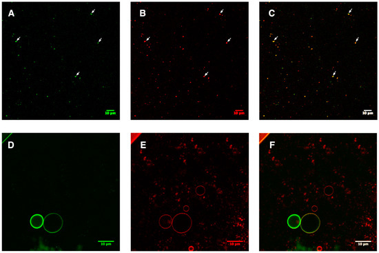 Monitoring the insertion of AqpZ-sGFP after reforming of the proteo-liposome. sGFP and lipids (stained via Nile red) are shown in green and red; a merged image is shown in C and F. (A–C), representative sample of the AqpZ-sGFP proteo-liposome formed after removal of detergents either via dialysis or bio-beads. The white arrows indicate the position of co-localized signals. (D–F), GUVs formed via fusion of AqpZ-sGFP proteo-liposome.